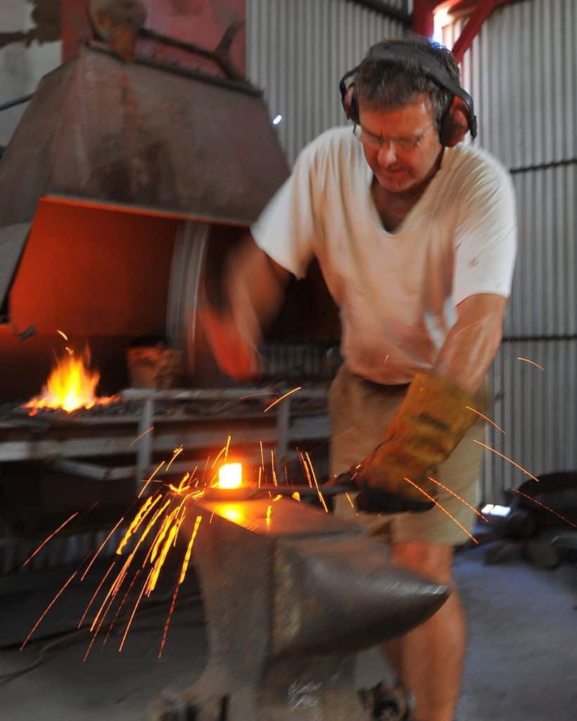After leaving school in 1984, I had various jobs in different fields of industry – none remotely associated with art, design or sculpture. During the mid 90s I was fabricating livestock handling equipment, fortunately as it turned out, next door to a well known Wagga artist, the late Michael Murphy. Amazed by Michael’s ability to transform steel into life, I was irresistibly drawn to creative metal work. Years after completing formal studies in the craft, I was fortunate enough to work in United Kingdom for a year with internationally renowned Artist Blacksmith, Brian Russell. Brian and I collaborated on sculptural and architectural pieces, including a number of public art pieces.